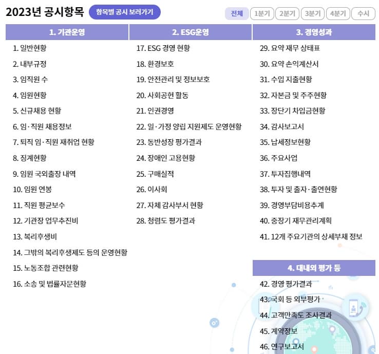 위에서 정리한 총 350개의 공공기관 중 관심이 있는 기관이 있으신 경우, 해당 기관의 자세한 정보를 확인하는 것이 가능합니다. 제가 알려드리는 사이트를 가시면 아래와 같이 약 40여 가지(내부규정, 임직원 수, 신규채용 현황, 임직원 연봉, 노동조합 현황, ESG 경영현황, 손익계산서, 감사보고서, 경영 평가결과, 투자집행내역, 국회 등 외부평가 결과)의 기관 정보가 공시되어 있습니다.