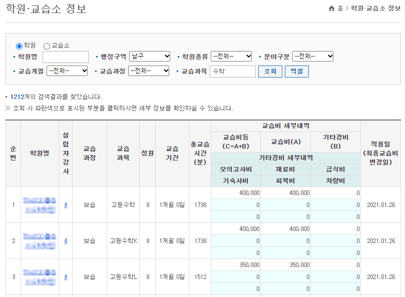 지금까지 울산 남구 학원가 밀집지역과 중학교 및 고등학교 배정 기준 등에 대해 정리해 보았습니다. 다음으로는 학원비를 조회하는 방법에 대해 말씀드리도록 하겠습니다. 울산 남구 옥동을 중심으로 260여 개의 학원들이 모여 있는 학원가 정보를 접하셨다면, 각 학원들의 학원비와 교육과목 및 시간 등이 궁금하실 것입니다. 자녀(학생)들이 다닐 학원을 결정할 때 수강료를 사전에 아는 것과 모르는 것은 매우 큰 차이가 있기 때문입니다. 특히, 학원비를 사전에 모르고 상담을 받을 경우 정해진 금액보다 더 많은 비용을 요구하는 일도 종종 발생하고 있습니다. 다행히 아래 사진처럼 울산 지역 모든 학원의 수강료를 정확하게 확인하는 것이 가능합니다.