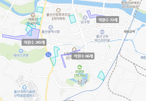 이 같은 배경으로 인해 이 지역에는 수도권 부럽지 않은 학원가가 형성되어 있습니다. 특히, 남구 옥동에는 아래 사진과 같이 약 260여 개의 학원들이 밀집해 있어 울산 시내 교육열과 학원가를 상징하는 지역입니다.