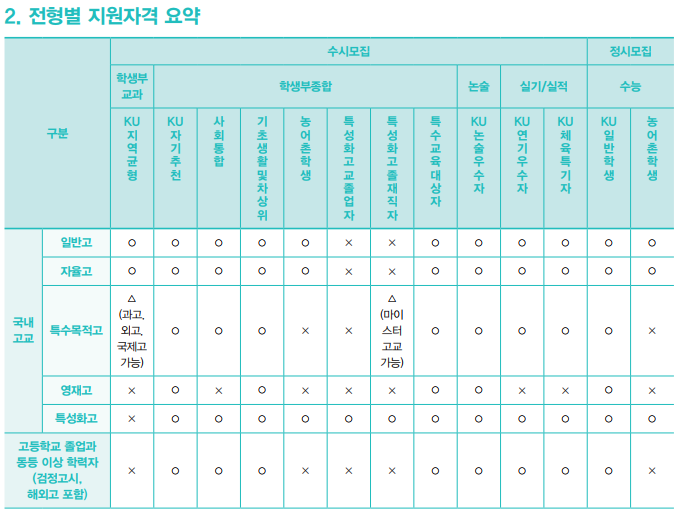 한편, 논술 100%로 입학생을 선발하는 KU논술우수자 전형은 아래 사진과 같이 일반고, 자율고, 특수목적고, 영재고, 특성화고, 검정고시 졸업자 등 모든 수험생이 지원가능하니 참고하시기 바랍니다.