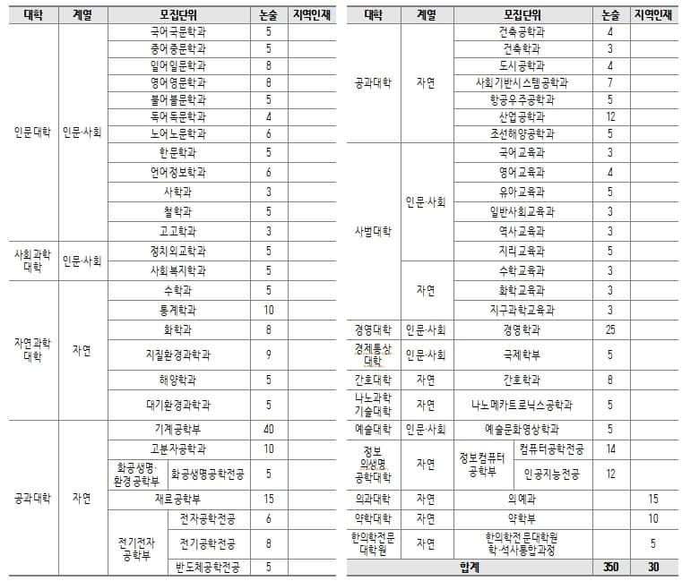 | 자연② | 공과대학, 건축학과, 도시공학과 | 국어, 수학, 영어, 사회/과학탐구, 한국사 | 국어, 수학, 영어, 사회/과학탐구 영역 중 수학 포함 2개 영역 등급 합 5 이내 | |